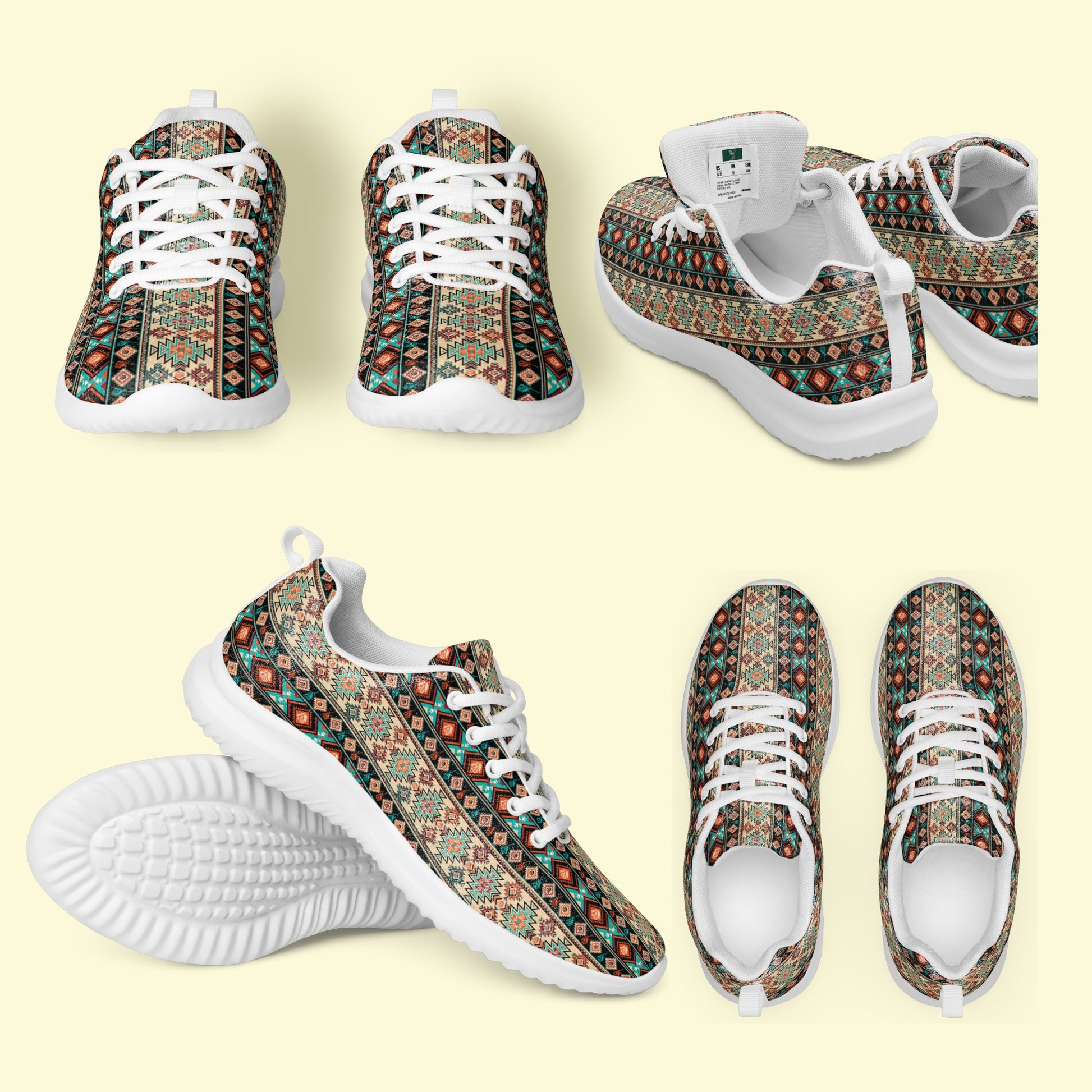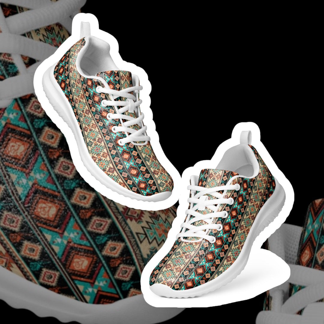 Whether you're a seasoned runner or simply looking for a stylish and comfortable shoe, our shoes are designed by Native American Theo Perez and copyrighted. Each shoe is a tribute to the enduring legacy of Native American artistry and storytelling. Step into a pair of tradition and storytelling and help support a tribal business that invests back into the community with 10% of proceeds pledged right back into the community.